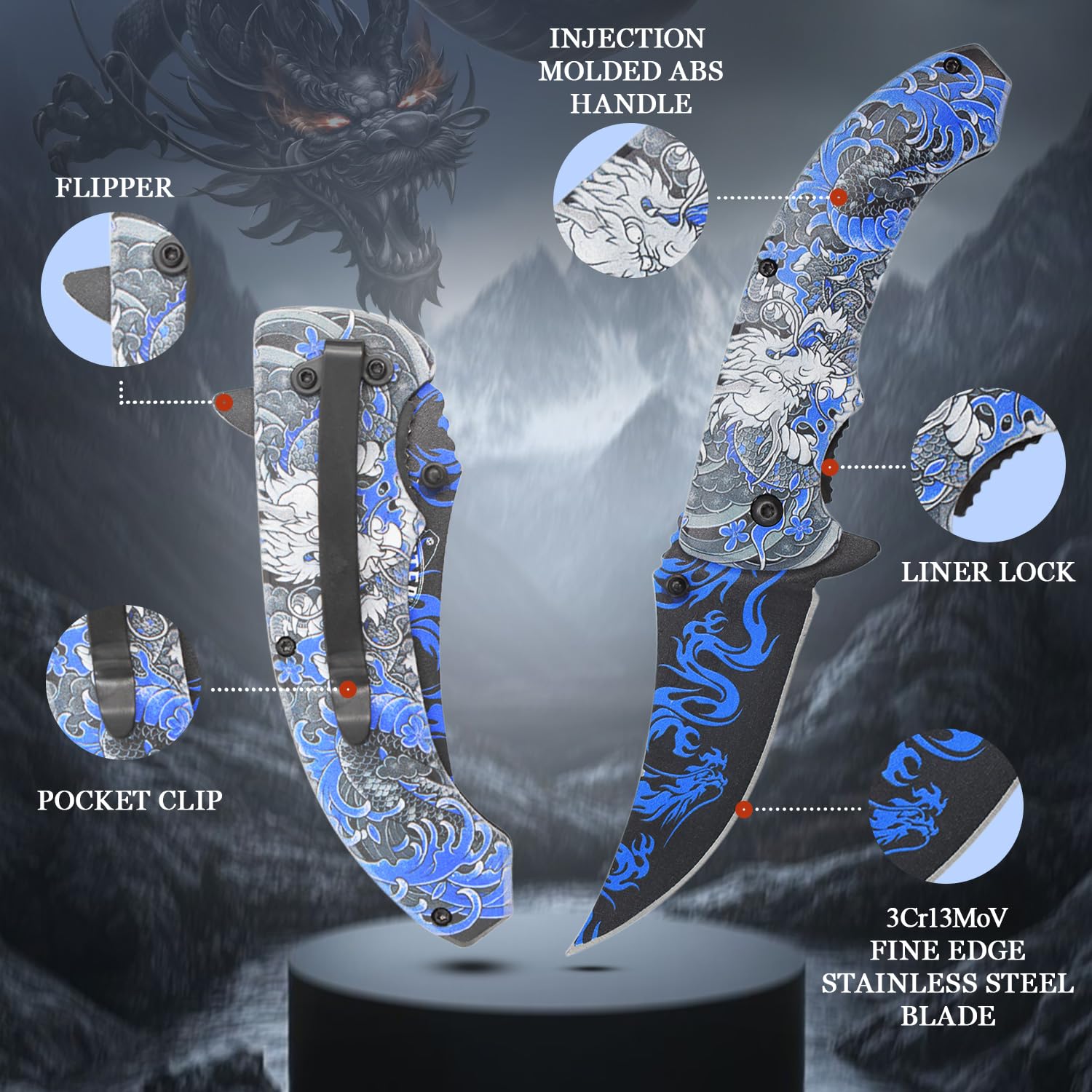 MASTER USA 8-Inch Folding Pocket Knife, Black Stainless Steel Drop Point Blade, ABS Handle with Liner Lock, Everyday Carry MU-A202 Series (Blue Dragon)