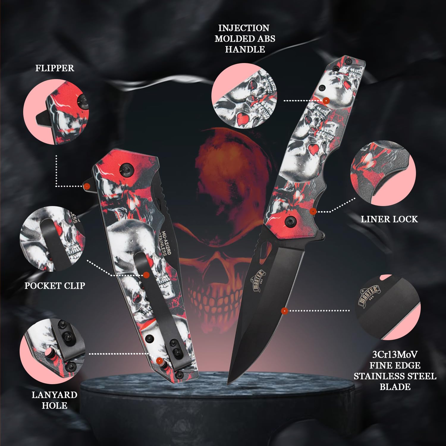 MASTER USA Folding Pocket Knife, 8-inch Overall Length, Skull Design on Embossed ABS Handle, 3.5-inch Blade, EDC (Red)