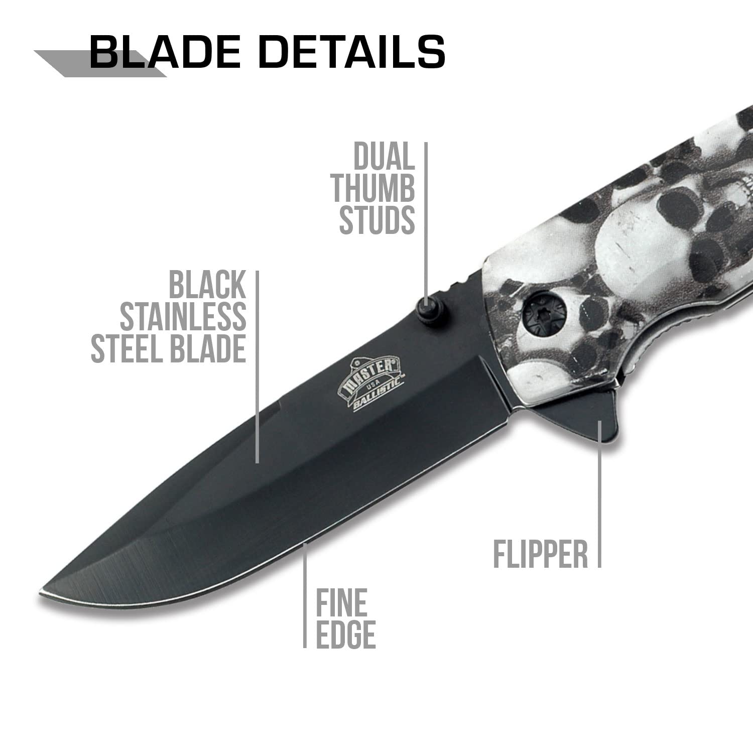 - SPECIAL FEATURES: Spring Assisted Open Folding Knife, Black Stainless Steel Blade, Dual Thumb Studs, Liner Lock, Grey Skull Camo Coated Nylon Fiber Handle with Pocket Clip.