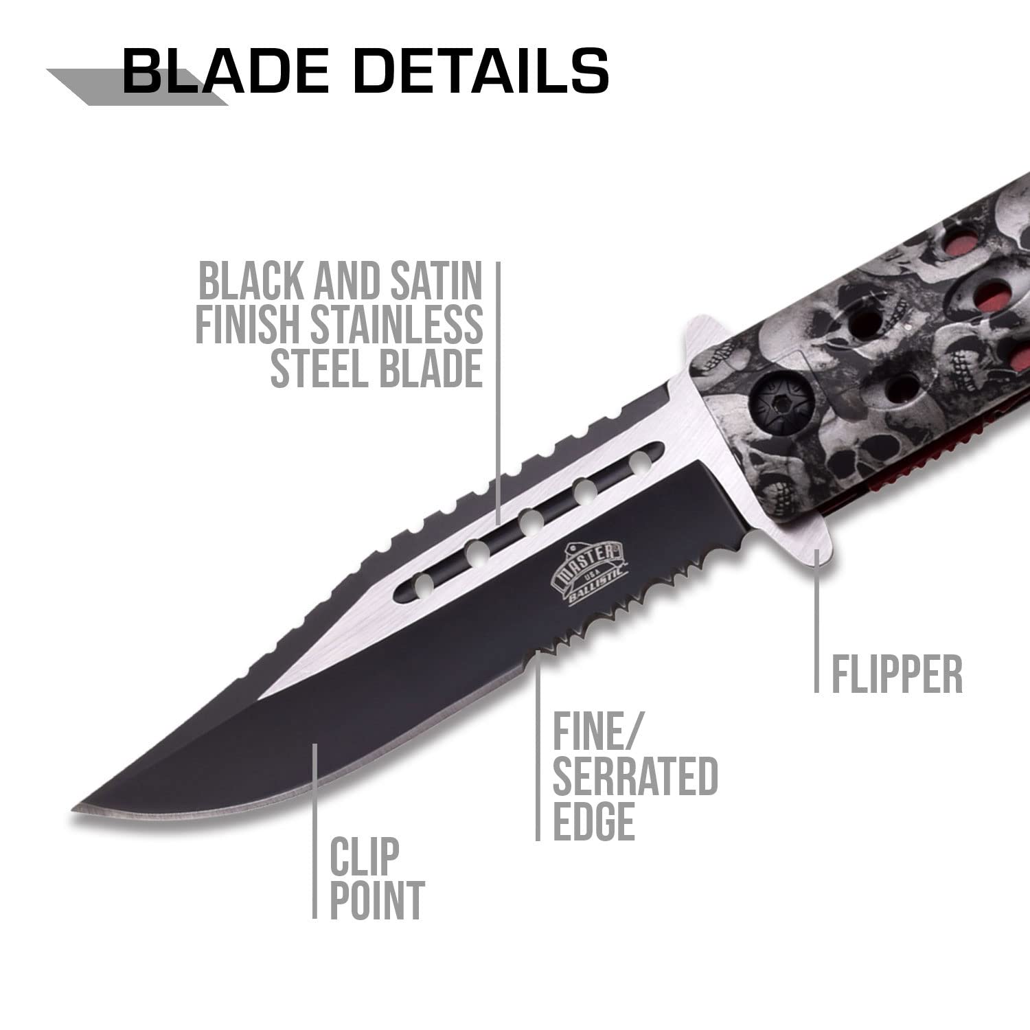 MASTER USA Spring Assisted Open Folding Knife – Partially Serrated Black/Satin Blade, Grey Skull Camo Nylon Fiber Handle w/Rope Cutter, Glass Punch, Pocket Clip, EDC, Self Defense- MU-A007GY